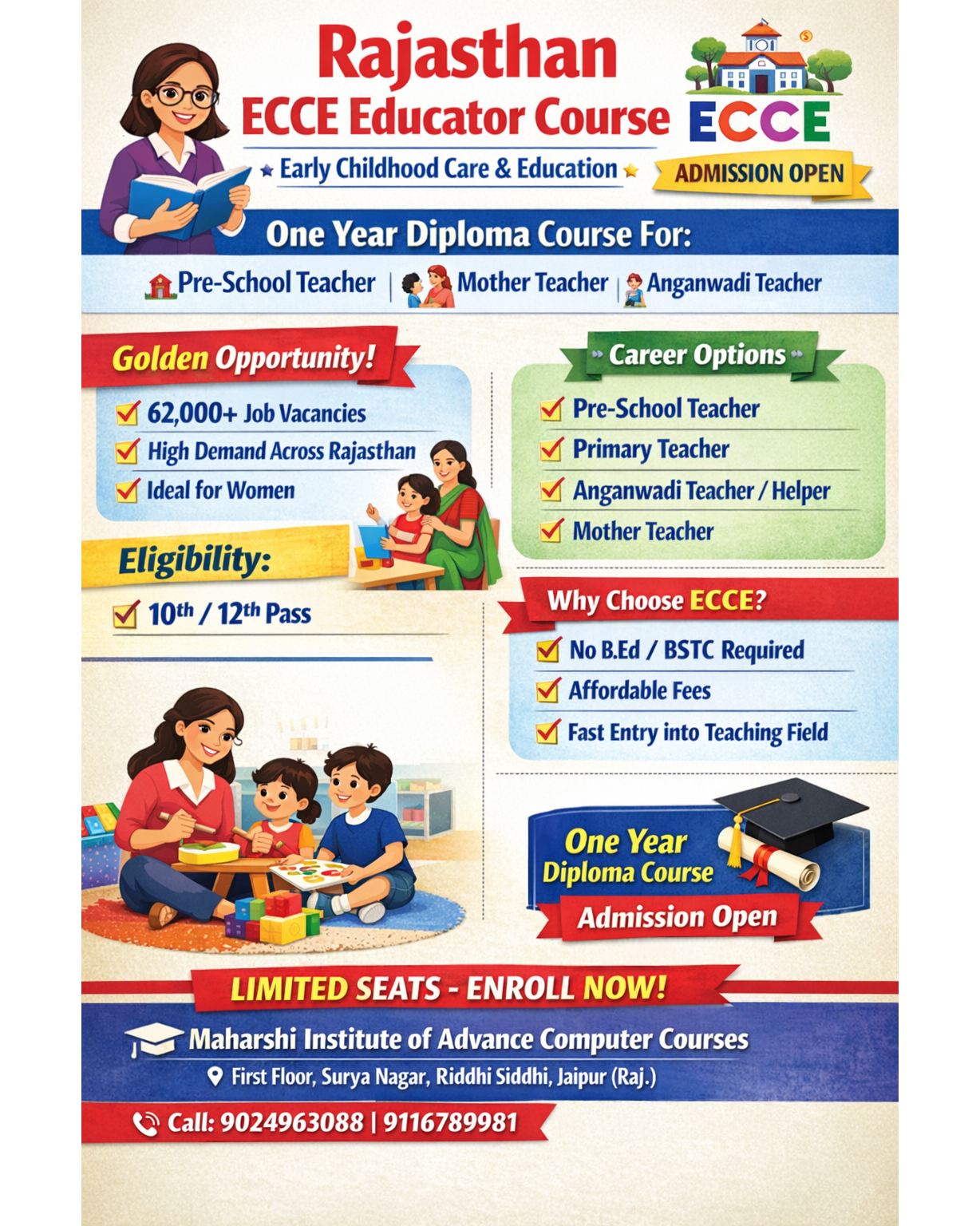 Rajasthan ECCE Educator Course – Admission Open! 🌟 Turn your passion for teaching into a rewarding career 👩🏫✨ Enroll in the One Year Diploma in Early Childhood Care & Education (ECCE) and step into the world of pre-school education. 🎓 Course Highlights: ✔ One Year Diploma ✔ No B.Ed / BSTC Required ✔ Affordable Fees ✔ Fast Entry into Teaching Field 💼 Career Opportunities: 🔹 Pre-School Teacher 🔹 Mother Teacher 🔹 Anganwadi Teacher / Helper 🔹 Primary Teacher 📌 Eligibility: 10th / 12th Pass 👩👧 Ideal for women candidates 📈 62, 000+ job opportunities across Rajasthan 🏫 Institute: Maharshi Institute of Advance Computer Courses 📍 First Floor, Surya Nagar, Riddhi Siddhi, Jaipur (Raj.) 📞 Call Now: 9024963088 | 9116789981 🚨 Limited Seats – Enroll Now! 🚨 #ECCE #RajasthanECCE #TeacherTraining #AdmissionOpen #PreSchoolTeacher #AnganwadiTeacher #TeachingCareer #MaharshiInstitute #WomenEmpowerment #EducationCareer