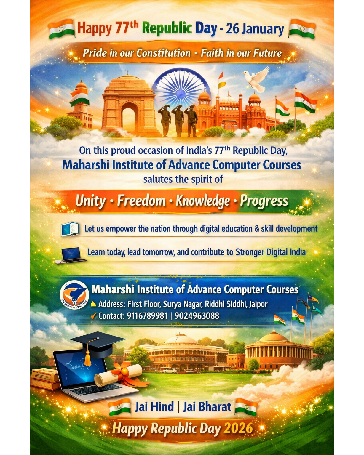 🇮🇳 Celebrating 77 Years of the Indian Republic 🇮🇳 Pride in our Constitution • Faith in our Future Maharshi Institute of Advance Computer Courses salutes the spirit of Unity • Freedom • Knowledge • Progress Let us empower India through digital education & skill development. Jai Hind | Jai Bharat 🇮🇳 #RepublicDay2026 #DigitalIndia #ProudIndian