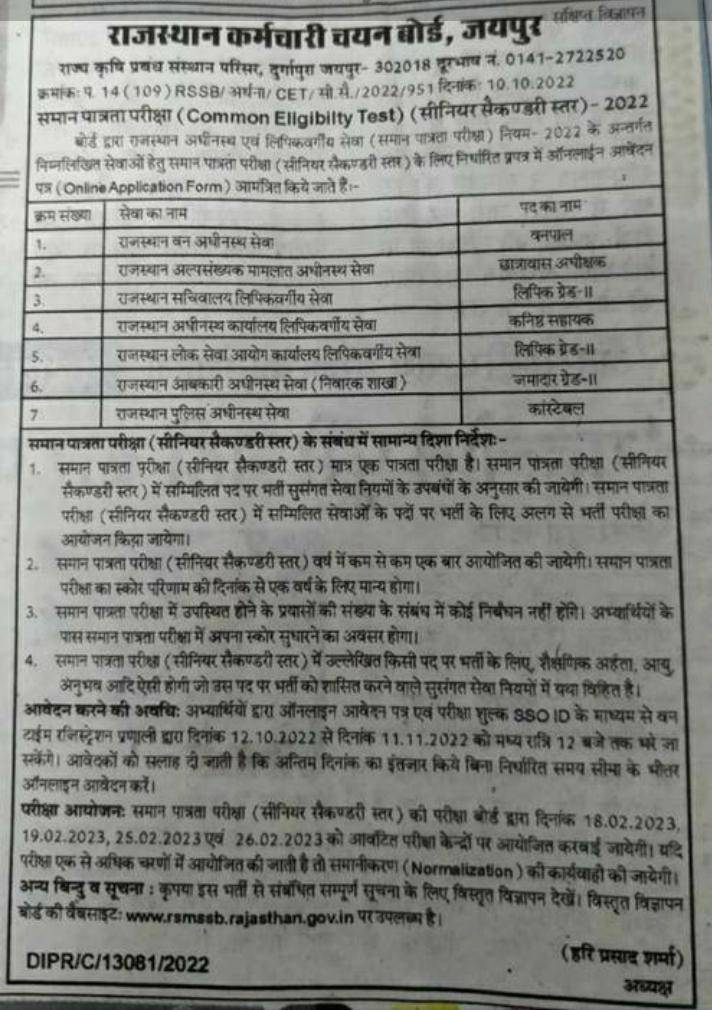 आप सभी के सूचनार्थ राजस्थान कर्मचारी चयन बोर्ड जयपुर द्वारा जारी विज्ञप्ति में क्रमांक 2 से 5 तक के पदों में RS-CIT भी एक योग्यता में शामिल है| विस्तृत विज्ञापन आपके सूचनार्थ संलग्न है|