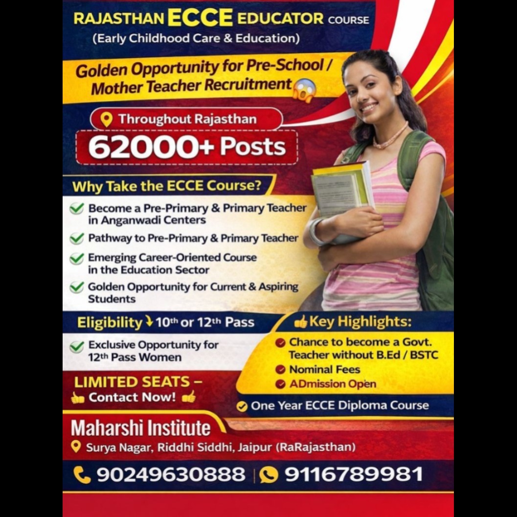 Golden Opportunity for Aspiring Teachers! 🌟 Enroll in the Rajasthan ECCE Educator Course (Early Childhood Care & Education) and pave your way to a rewarding career! 🎓 ✅ 62, 000+ posts available throughout Rajasthan ✅ Become a Pre-Primary & Primary Teacher in Anganwadi Centers ✅ Pathway to Government Teaching without B.Ed / BSTC ✅ Exclusive for 10th & 12th Pass Women ✅ One Year ECCE Diploma Course with Nominal Fees 📍 Maharshi Institute – Surya Nagar, Riddhi Siddhi, Jaipur 📞 Contact: 9024963088 | 9116789981 🚀 Limited Seats – Enroll Now & Shape Your Future! #ECCE #TeacherTraining #PreSchoolTeacher #WomenEmpowerment #Jaipur #MaharshiInstitute #CareerOpportunity #Education #EarlyChildhoodCare #TeachingCareer
