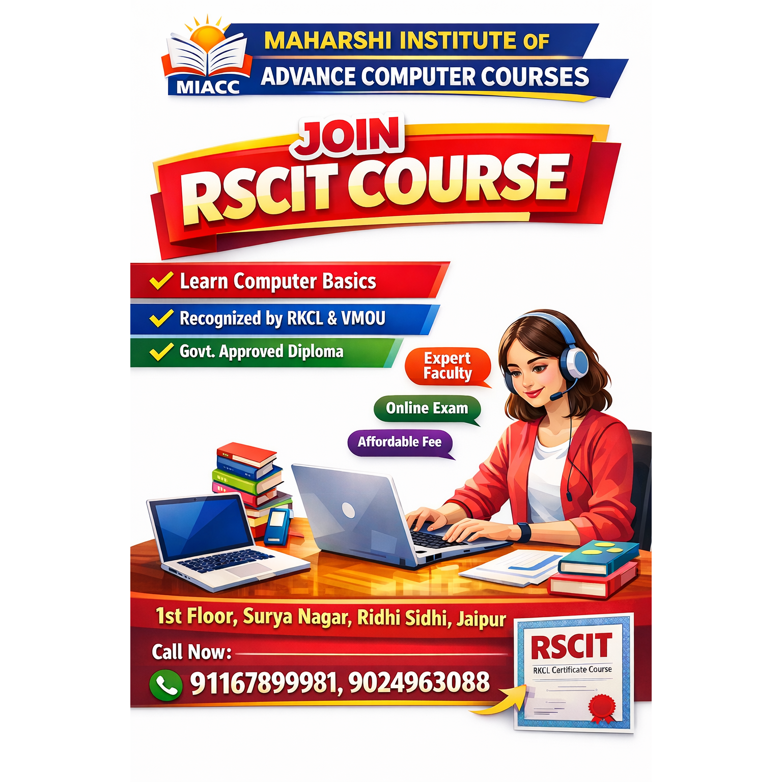 💻 Join RSCIT Course at Maharshi Institute of Advance Computer Courses! ✅ Learn Computer Basics ✅ Govt. Approved Diploma ✅ Recognized by RKCL & VMOU 🎓 Expert Faculty | 🌐 Online Exam | 💰 Affordable Fee 📍 1st Floor, Surya Nagar, Ridhi Sidhi, Jaipur 📞 Call Now: 9116789981, 9024963088 Start your digital journey today! 🚀