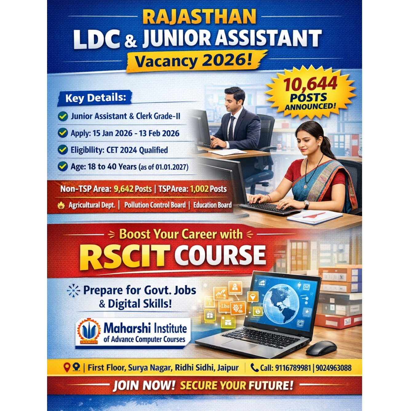 राजस्थान LDC & जूनियर असिस्टेंट भर्ती 2026 कुल पद: 10, 644 मुख्य जानकारी (Key Details): पद: जूनियर असिस्टेंट और क्लर्क ग्रेड-II आवेदन की तिथि: 15 जनवरी 2026 से 13 फरवरी 2026 तक योग्यता: CET 2024 क्वालिफाइड आयु सीमा: 18 से 40 वर्ष (01.01.2027 के अनुसार) पद वितरण: Non-TSP क्षेत्र: 9, 642 पद TSp क्षेत्र: 1, 002 पद विभाग: कृषि विभाग, प्रदूषण नियंत्रण बोर्ड, शिक्षा बोर्ड करियर को बढ़ावा दें – RSCIT कोर्स के साथ सरकारी नौकरियों की तैयारी और डिजिटल स्किल्स सीखें। संस्थान: महार्षि इंस्टीट्यूट ऑफ एडवांस कंप्यूटर कोर्सेस पता और संपर्क: स्थान: फर्स्ट फ्लोर, सूर्या नगर, ऋद्धि सिद्धि, जयपुर फोन नंबर: 9116789981, 9024963088
