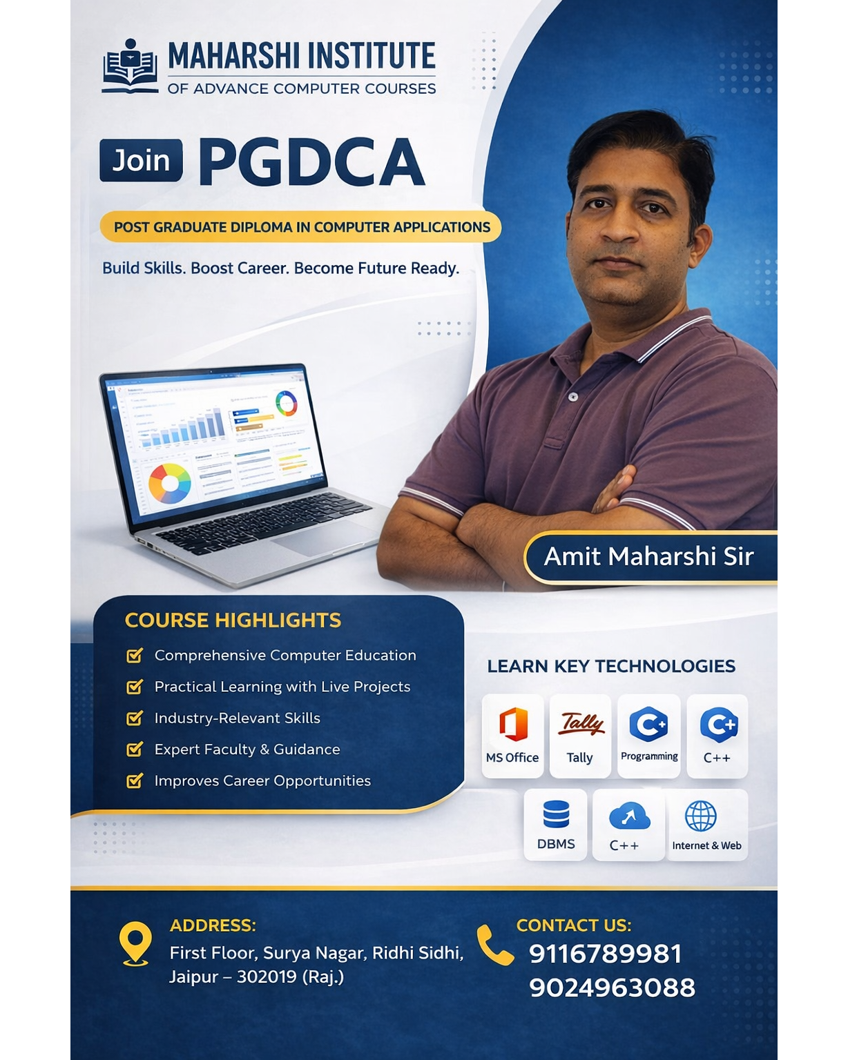 Level up your career with PGDCA! π Learn MS Office, Tally, C++, DBMS & more with Amit Maharshi Sir. Practical skills + expert guidance = Future Ready! π»β¨ #PGDCA #CareerBoost #MaharshiInstitute' 'Donβt just learn computers, master them! Join PGDCA at Maharshi Institute and get hands-on experience with live projects. π #FutureReady #ComputerSkills #Jaipur' 'Build skills. Boost career. Become future-ready! PGDCA at Maharshi Institute with expert faculty is your gateway to success. ππΌ #PGDCA #SkillUp #CareerGrowth' 'From MS Office to C++ β learn everything you need to succeed in IT! Join PGDCA today with Amit Maharshi Sir. π»π #MaharshiInstitute #PGDCA #TechSkills' 'Your career deserves the best! Join PGDCA at Maharshi Institute, Jaipur. Hands-on learning, industry-relevant skills & expert guidance await! ππ‘ #FutureReady #JaipurEducation #PGDCA'