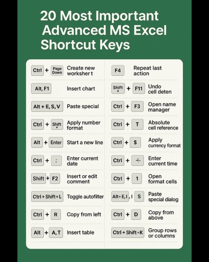 Master the 20 Most Important Advanced MS Excel Shortcut Keys and save time like a pro! ⏱️💻 ✅ Create worksheets faster ✅ Apply formats instantly ✅ Copy, paste, and manage data effortlessly 💡 Tip: Practice these shortcuts daily and become an Excel wizard! #ExcelTips #ShortcutKeys #MSExcel #ProductivityHacks #ExcelMaster #WorkSmart Want to work faster and smarter in MS Excel? These 20 most important advanced shortcut keys will make you an Excel pro! From creating new worksheets, inserting charts, and pasting special data to applying number formats, currency formats, and absolute cell references – these shortcuts save time and boost productivity. ✅ Enter current date or time, toggle autofilter, copy from left or above, start new lines, and group rows or columns effortlessly. Practice these shortcuts daily and impress everyone with your Excel speed and efficiency! 🌟 #ExcelTips #MSExcel #ShortcutKeys #Productivity #WorkSmart