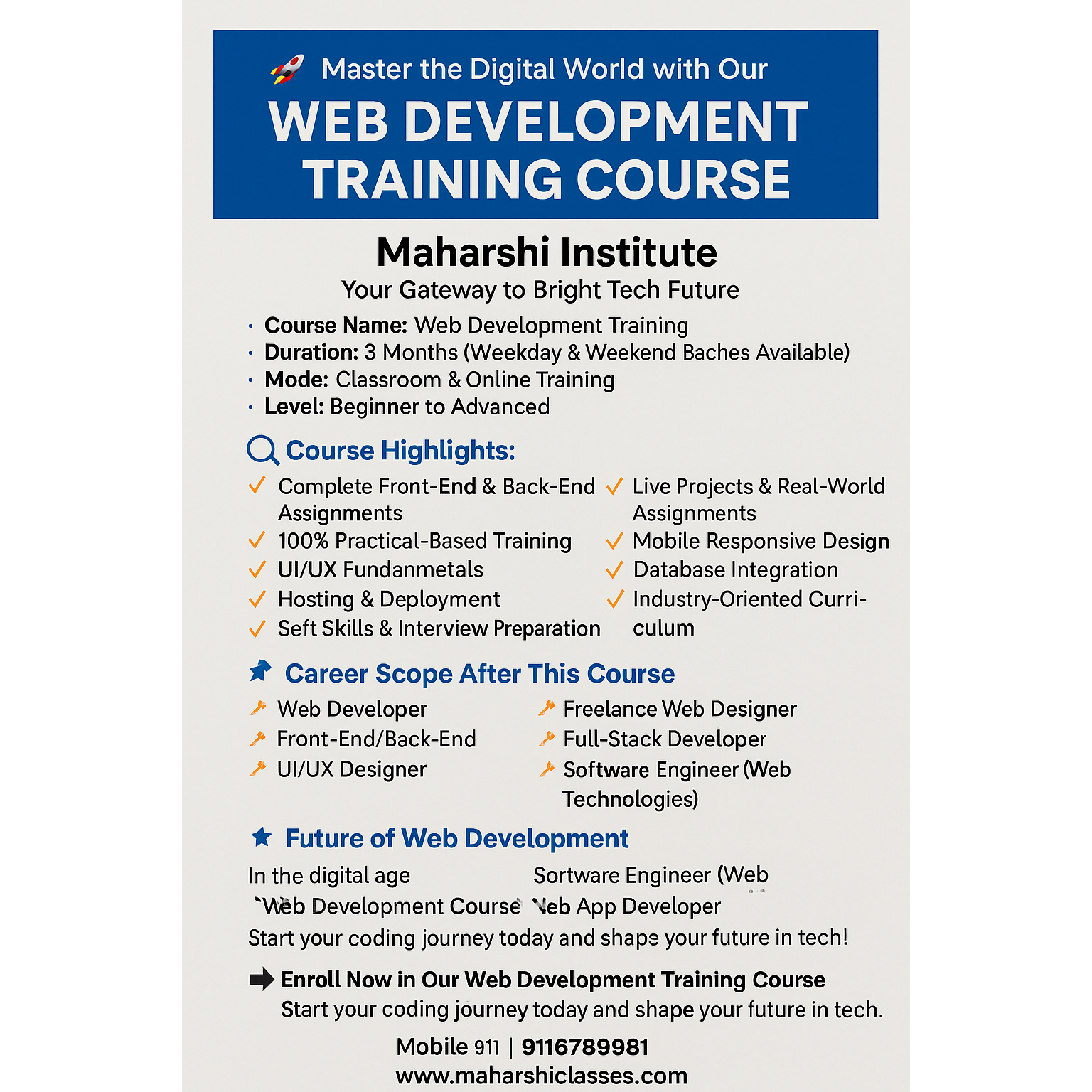 π Master the Digital World with Our Web Development Training Course π Maharshi Institute β Your Gateway to a Bright Tech Future π Course Name: Web Development Training β³ Duration: 3 Months (Weekday & Weekend Batches Available) π₯οΈ Mode: Classroom & Online Training π Level: Beginner to Advanced π Course Highlights: β Complete Front-End & Back-End Coverage From the basics of HTML, CSS, and JavaScript to advanced frameworks like ReactJS, Node.js, and Express β this course ensures you are skilled in every corner of modern web development. β Live Projects & Real-World Assignments Gain hands-on experience by working on real websites, portfolios, and e-commerce projects under expert guidance. β 100% Practical-Based Training Learn by doing! Practical implementation is prioritized over theoretical lessons to make you job-ready. β Mobile Responsive Design Master the art of building websites that look great on all devices β from desktops to smartphones. β UI/UX Fundamentals Understand the principles of user-friendly design and website aesthetics using tools like Figma and Adobe XD. β Database Integration Learn how to connect websites with databases using MySQL and MongoDB for real-time dynamic data handling. β Hosting & Deployment Get trained on domain purchase, hosting, and how to deploy your website using GitHub Pages, Netlify, and cPanel. β Soft Skills & Interview Preparation Improve communication, resume building, and attend mock interviews for placement success. β Industry-Oriented Curriculum Stay up-to-date with trending tech stacks like MERN (MongoDB, Express, React, Node) and JAMstack. β Certification & Support Receive a Government Recognized Certificate after course completion and lifetime query support. πΌ Career Scope After This Course: π Web Developer π Front-End/Back-End Developer π UI/UX Designer π Freelance Web Designer π WordPress Developer π Full-Stack Developer π Software Engineer (Web Technologies) π Web App Developer Whether youβre a student, job seeker, freelancer, or business owner, this course opens doors to abundant opportunities in the digital economy. π Future of Web Development: In the digital age, every business needs a strong online presence. The demand for skilled web developers is skyrocketing across the globe. From startups to MNCs, every company is hiring professionals who can build fast, responsive, and secure websites. π Why Learn Web Development? Because the internet is your canvas, and coding is your brush. You can build websites, start freelance work, create your own startup, or land a high-paying job in tech firms. As long as businesses need websites and users interact with the web, web development will continue to be one of the most in-demand skills in the tech world. π Contact Us: Maharshi Institute, Surya Nagar, Riddhi Siddhi, Jaipur π± 9116789981 π www.maharshiclasses.com π― Enroll Now in Our Web Development Training Course π‘ Start your coding journey today and shape your future in tech!