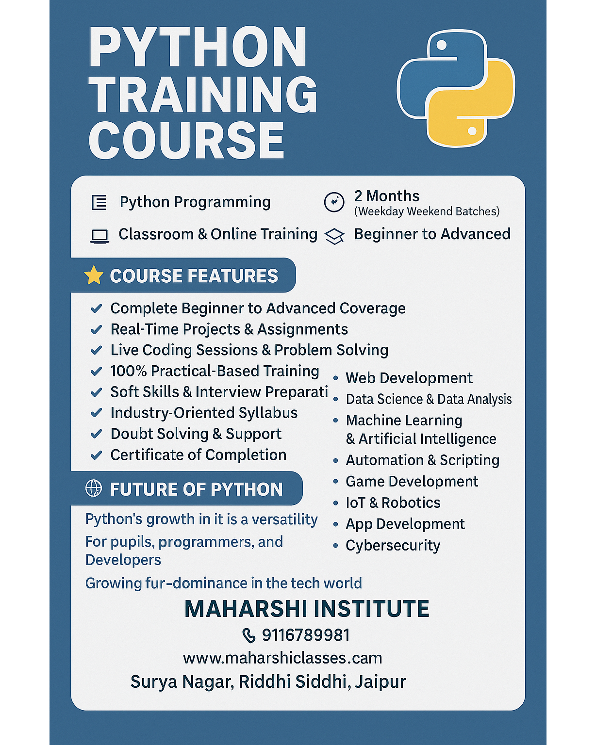 π Python Training Course at Maharshi Institute β Your Gateway to the Future of Programming! π Course Name: Python Programming β± Duration: 2 Months (Weekday & Weekend Batches Available) π’ Mode: Classroom & Online Training π Level: Beginner to Advanced π Course Overview: Python is one of the most powerful, versatile, and beginner-friendly programming languages in the world. Our Python Training Course at Maharshi Institute is designed to help students, professionals, and enthusiasts gain hands-on coding experience, develop logic, and build a strong foundation in programming. Whether you're a beginner or someone looking to upskill, this course provides a step-by-step approach to learning Python from scratch. β Course Features: β Complete Beginner to Advanced Coverage β Real-Time Projects & Assignments β Live Coding Sessions & Problem Solving β 100% Practical-Based Training β Soft Skills & Interview Preparation β Industry-Oriented Syllabus β Doubt Solving & Support β Certificate of Completion π§βπ» What You Will Learn: Basics of Python (Variables, Data Types, Operators) Control Structures (If-Else, Loops) Functions, Modules & Packages File Handling & Exception Handling Object-Oriented Programming (OOP) Working with Libraries like NumPy, Pandas, and Matplotlib Introduction to Web Development with Flask/Django Mini Projects and Use Cases Resume & Interview Guidance π― Career Scope After This Course: Learning Python opens doors to a wide range of high-paying jobs in todayβs digital world. Python is used in: Web Development Data Science & Data Analysis Machine Learning & Artificial Intelligence Automation & Scripting Game Development IoT & Robotics App Development Cybersecurity You can work as a Python Developer, Data Analyst, AI/ML Engineer, Automation Engineer, or Backend Developer. It is also the most demanded language in global freelancing platforms and startups. π Future of Python: Python continues to grow rapidly due to its simplicity and flexibility. It is the most popular programming language as per TIOBE and Stack Overflow rankings. With increasing reliance on Data Science, AI, and Automation, Python is predicted to rule the tech world for decades to come. Learning Python now means future-proofing your career in the ever-evolving tech industry. π Why Choose Maharshi Institute? Expert Trainers with Industry Experience Well-Equipped Lab & Online Access Free Study Material & Practice Tests Job Assistance & Placement Support Affordable Fees & Flexible Timings π Call Us: 9116789981 | π Website: www.maharshiclasses.com π« Location: Surya Nagar, Riddhi Siddhi, Jaipur π’ Enroll Now in Our Python Training Course and Build a Bright Future in Tech! #LearnPython #PythonTraining #MaharshiInstitute #CodingCourse #FutureWithPython