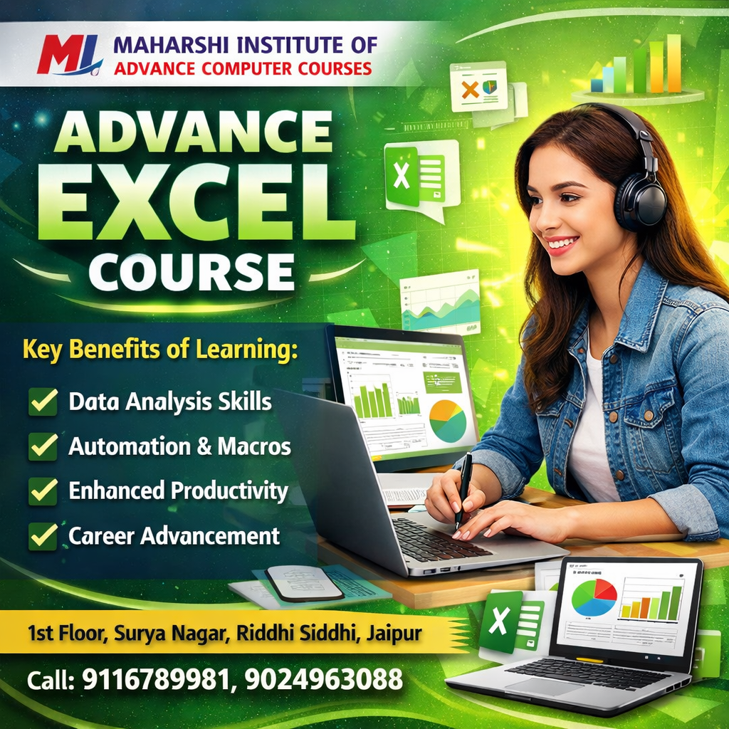 We welcome to Maharshi Institute - Your Gateway to RSCIT Success! Are you ready to embark on a transfo.... e you tired of manual data entry, complex calculations, and time-consuming reports? It's time to supercharge your skills with the Advance Excel Course at Maharshi Institute of Advance Computer Courses! ๐ In today's data-driven world, proficiency in Microsoft Excel is a non-negotiable skill for every professional. Our advanced course goes beyond the basics, turning you into a true Excel expert. Whether you're a student, a working professional, or an entrepreneur, mastering these advanced techniques will significantly boost your productivity and career prospects. What sets our course apart? Master Advanced Formulas & Functions: Dive deep into powerful functions like VLOOKUP, HLOOKUP, PivotTables, and advanced formulas that will automate your tasks and save you hours. Data Analysis & Visualization: Learn to transform raw data into stunning, insightful dashboards and charts. Our course covers advanced data modeling, data visualization, and how to use tools like Power Query and Power Pivot. Automate with Macros & VBA: Say goodbye to repetitive tasks! We'll teach you how to record and write macros using VBA (Visual Basic for Applications) to automate your workflows and make your daily tasks effortless. Career Advancement: An advanced Excel certification is a powerful asset on your resume. It's a skill that's in high demand across finance, marketing, human resources, and countless other sectors. Our expert faculty provides hands-on, practical training, ensuring you not only understand the concepts but can also apply them in real-world scenarios. We're committed to helping you gain a competitive edge and unlock new opportunities. Don't let your data hold you backโlearn to command it! Ready to level up your skills? Enroll today! Visit Us: Maharshi Institute of Advance Computer Courses First Floor, Surya Nagar, Riddhi Siddhi, Jaipur Contact Us: ๐ 9116789981 ๐ 9024963088 #AdvanceExcel #ExcelTraining #ExcelCourse #MicrosoftExcel #DataAnalysis #DataVisualization #VBA #Macros #Jaipur #MaharshiInstitute #CareerGrowth #SkillsDevelopment #ExcelExpert #ProfessionalDevelopment #JobReady #ComputerCourses #EducationJaipur #UnlockYourPotential #ProductivityHacks #LearnExcel