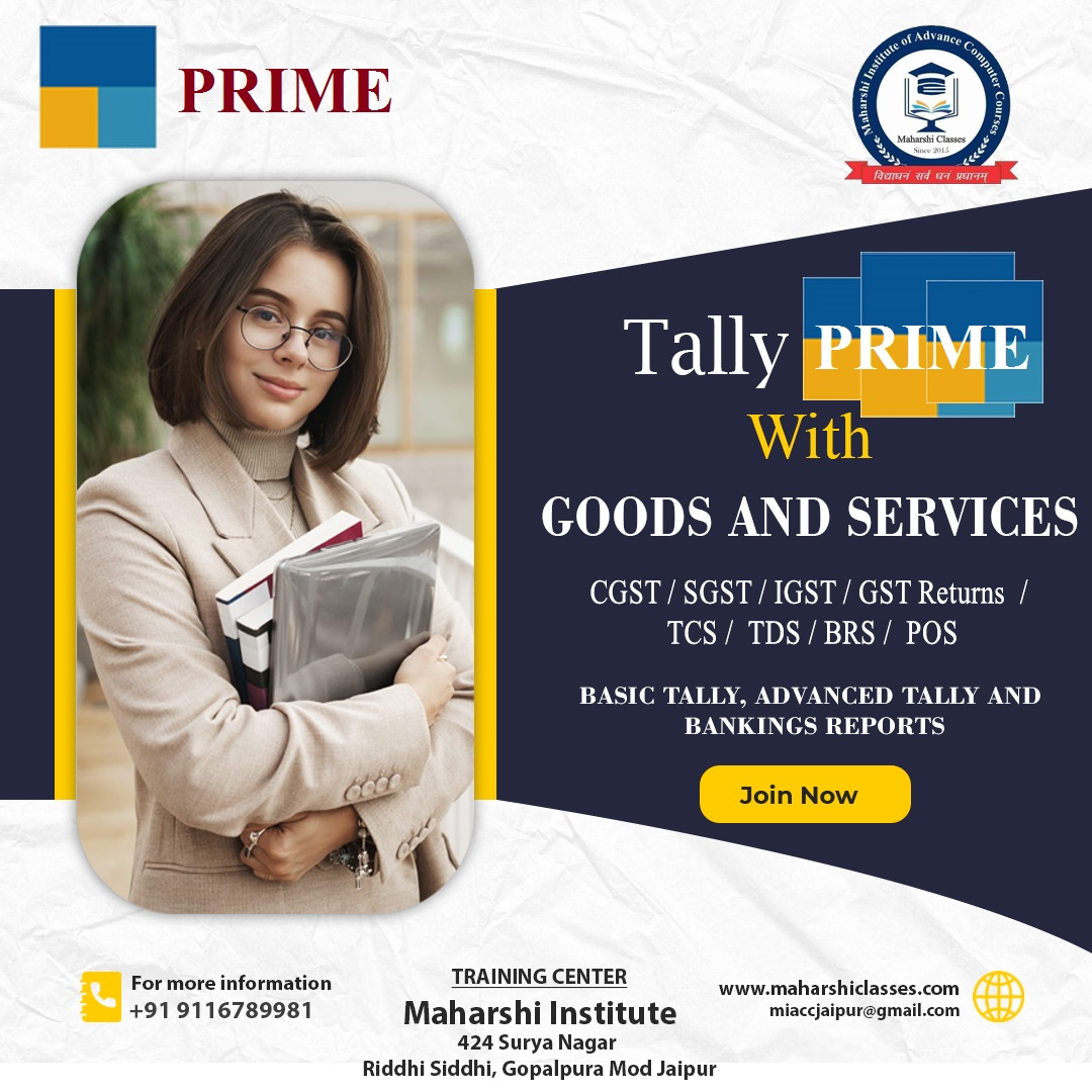Welcome to Maharshi Institute's TALLY Course Hub in Jaipur! Are you looking to master TALLY and become proficient in accounting software? Maharshi Institute, located at Plot 424 Surya Nagar, Gopal Pura Mode, Jaipur, is your destination for comprehensive TALLY courses designed to empower you with essential skills in finance management. Whether you're a beginner or seeking advanced expertise, our tailored programs cater to all levels of learners. About TALLY: TALLY is a renowned accounting software widely used by businesses globally for efficient financial management. Learning TALLY opens doors to diverse career opportunities in accounting, finance, and business administration. Why Choose Maharshi Institute for TALLY Training? At Maharshi Institute, we stand out as a premier educational institution for TALLY courses in Jaipur. Here’s why aspiring learners choose us: Expert Faculty: Our courses are conducted by experienced instructors with in-depth knowledge of TALLY and practical industry experience. Flexible Learning: We offer flexible timings for both classroom and online TALLY courses to accommodate your schedule. Comprehensive Curriculum: Our TALLY course syllabus covers everything from basics to advanced topics, ensuring a holistic learning experience. Affordable Fees: We provide competitive TALLY course fees, making quality education accessible to all. Job Placement Assistance: Maharshi Institute supports students with job placement assistance and career guidance upon course completion. TALLY Courses Offered at Maharshi Institute: We offer a range of TALLY courses tailored to meet your learning needs: TALLY Course PDF: Access comprehensive course materials in PDF format for easy reference and study. TALLY Course Fees: Learn about our affordable TALLY course fees suitable for students and professionals. TALLY Course in Jaipur: Join our TALLY courses conducted at our institute in Jaipur, centrally located for your convenience. TALLY Course Near Me: Locate our institute easily from anywhere in Jaipur for hassle-free learning. TALLY Course Syllabus: Explore our detailed TALLY course syllabus covering topics like basic accounting, inventory management, GST compliance, and more. TALLY Course Free: We offer introductory sessions and demo classes to give you a taste of our TALLY courses. TALLY Course Online: Enroll in our online TALLY courses and learn from the comfort of your home or office. TALLY Course Eligibility: Discover the prerequisites and eligibility criteria for enrolling in our TALLY courses. Contact Maharshi Institute Today! Ready to embark on your TALLY learning journey? Contact Maharshi Institute at Plot 424 Surya Nagar, Gopal Pura Mode, Jaipur, or reach out to us via phone at 9116789981, 9024963088, 7378161093. Visit our website at www.maharshiclasses.com for more information on course offerings, schedules, fees, and enrollment details. Join Maharshi Institute's TALLY course and take the first step towards a rewarding career in finance and accounting. Empower yourself with practical skills and knowledge that employers value. Enroll today and unlock your potential with TALLY expertise! Tally course in Jaipur Best Tally training in Jaipur Tally certification course Jaipur Tally accounting course Jaipur Tally course fees in Jaipur Advanced Tally course Jaipur Tally ERP 9 course Jaipur Tally Prime course Jaipur Tally course Jaipur Rajasthan Tally institute in Jaipur Rajasthan Best Tally classes near me Jaipur Tally training center Jaipur Rajasthan Tally coaching institute Jaipur Tally with GST course in Jaipur Accounting and Tally course Jaipur Job oriented Tally courses Jaipur Practical Tally training Jaipur Online Tally course Jaipur Rajasthan Best institute for Tally course in Jaipur Affordable Tally training in Jaipur Rajasthan Tally ERP 9 and Tally Prime training Jaipur Learn Tally with GST in Jaipur Short-term Tally accounting courses Jaipur Maharshi Institute Tally course Jaipur Maharshi Institute Tally ERP 9 training Jaipur Tally Prime course at Maharshi Institute Jaipur tally course near gopal pura mode, jaipur Tally course near me with fees Tally course fees in Jaipur Tally course near me free Tally course in Jaipur Tally course in mansarovar jaipur Top 10 Tally institute in Jaipur Tally course syllabus tally prime course pdf tally prime course free tally prime course syllabus tally prime course fees Tally prime course free download tally prime online course free with certificate tally prime course near me tally prime course in hindi tally with gst course pdf tally with gst course fees tally with gst course duration Tally with gst course pdf download Tally with gst course free Tally with gst course free download tally with gst course near me tally gst course with placement tally course pdf tally course nielit tally course syllabus Tally course online tally course fees tally course near me tally course in jaipur tally course fees in jaipur tally accounting course pdf tally course fees Tally accounting course online Tally accounting course free tally course near me tally classes near me with fees tally course salary tally course fees in jaipur Tally What is Tally ? What is Tally Prime ? What is Prime ? What is Tax ? What is Stock Transfer ? What is Ladger ? What is Accounting ? What is Tally Course ? What is E Accounting ? What is GST ? What is TDS ? What is Payroll ? What is Compund unit ? What is TCS ? How to Fill GST Return ? How To fill GSTR 1 ? How To fill GSTR 3B ? How To fill GSTR 9 ? How To fill GSTR 2A ? How to Save Income Tax ? What is Input Tax Credit ITC ? What is Output Tax OT ? Tally Course Near Me Tally Course in Gopalpura Jaipur Tally Course in Mahesh Nagar Tally Course in Mansarovar Tally Course in Jaipur Tally Course in Vaishali Nagar Tally Course in Raja Park Tally Course in Jagatpura Tally Course in Kalwar Road Tally Course in Civil Lines Tally Course in C Scheme Tally Course in Malviya Nagar Tally Course in Ajmer Road Tally Course in Jhotwara Tally 