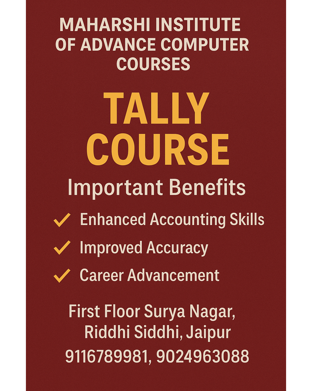 Welcome to Maharshi Institute's TALLY Course Hub in Jaipur! Are you looking to master TALLY and bec.... Welcome to Maharshi Institute's TALLY Course Hub in Jaipur! Are you looking to master TALLY and bec.... Welcome to Maharshi Institute's TALLY Course Hub in Jaipur! Are you looking to master TALLY and bec.... Welcome to Maharshi Institute's TALLY Course Hub in Jaipur! Are you looking to master TALLY and bec.... Welcome to Maharshi Institute's TALLY Course Hub in Jaipur! Are you looking to master TALLY and bec.... Welcome to Maharshi Institute's TALLY Course Hub in Jaipur! Are you looking to master TALLY and bec.... Welcome to Maharshi Institute's TALLY Course Hub in Jaipur! Are you looking to master TALLY and bec.... Welcome to Maharshi Institute's TALLY Course Hub in Jaipur! Are you looking to master TALLY and bec.... Welcome to Maharshi Institute's TALLY Course Hub in Jaipur! Are you looking to master TALLY and bec... Welcome to Maharshi Institute's TALLY Course Hub in Jaipur! Are you looking to master TALLY and become proficient in accounting software? Maharshi Institute, located at Plot 424 Surya Nagar, Gopal Pura Mode, Jaipur, is your destination for comprehensive TALLY courses designed to empower you with essential skills in finance management. Whether you're a beginner or seeking advanced expertise, our tailored programs cater to all levels of learners. About TALLY: TALLY is a renowned accounting software widely used by businesses globally for efficient financial management. Learning TALLY opens doors to diverse career opportunities in accounting, finance, and business administration. Why Choose Maharshi Institute for TALLY Training? At Maharshi Institute, we stand out as a premier educational institution for TALLY courses in Jaipur. Here’s why aspiring learners choose us: Expert Faculty: Our courses are conducted by experienced instructors with in-depth knowledge of TALLY and practical industry experience. Flexible Learning: We offer flexible timings for both classroom and online TALLY courses to accommodate your schedule. Comprehensive Curriculum: Our TALLY course syllabus covers everything from basics to advanced topics, ensuring a holistic learning experience. Affordable Fees: We provide competitive TALLY course fees, making quality education accessible to all. Job Placement Assistance: Maharshi Institute supports students with job placement assistance and career guidance upon course completion. TALLY Courses Offered at Maharshi Institute: We offer a range of TALLY courses tailored to meet your learning needs: TALLY Course PDF: Access comprehensive course materials in PDF format for easy reference and study. TALLY Course Fees: Learn about our affordable TALLY course fees suitable for students and professionals. TALLY Course in Jaipur: Join our TALLY courses conducted at our institute in Jaipur, centrally located for your convenience. TALLY Course Near Me: Locate our institute easily from anywhere in Jaipur for hassle-free learning. TALLY Course Syllabus: Explore our detailed TALLY course syllabus covering topics like basic accounting, inventory management, GST compliance, and more. TALLY Course Free: We offer introductory sessions and demo classes to give you a taste of our TALLY courses. TALLY Course Online: Enroll in our online TALLY courses and learn from the comfort of your home or office. TALLY Course Eligibility: Discover the prerequisites and eligibility criteria for enrolling in our TALLY courses. Contact Maharshi Institute Today! Ready to embark on your TALLY learning journey? Contact Maharshi Institute at Plot 424 Surya Nagar, Gopal Pura Mode, Jaipur, or reach out to us via phone at 9116789981, 9024963088, 7378161093. Visit our website at www.maharshiclasses.com for more information on course offerings, schedules, fees, and enrollment details. Join Maharshi Institute's TALLY course and take the first step towards a rewarding career in finance and accounting. Empower yourself with practical skills and knowledge that employers value. Enroll today and unlock your potential with TALLY expertise! Tally course in Jaipur Best Tally training in Jaipur Tally certification course Jaipur Tally accounting course Jaipur Tally course fees in Jaipur Advanced Tally course Jaipur Tally ERP 9 course Jaipur Tally Prime course Jaipur Tally course Jaipur Rajasthan Tally institute in Jaipur Rajasthan Best Tally classes near me Jaipur Tally training center Jaipur Rajasthan Tally coaching institute Jaipur Tally with GST course in Jaipur Accounting and Tally course Jaipur Job oriented Tally courses Jaipur Practical Tally training Jaipur Online Tally course Jaipur Rajasthan Best institute for Tally course in Jaipur Affordable Tally training in Jaipur Rajasthan Tally ERP 9 and Tally Prime training Jaipur Learn Tally with GST in Jaipur Short-term Tally accounting courses Jaipur Maharshi Institute Tally course Jaipur Maharshi Institute Tally ERP 9 training Jaipur Tally Prime course at Maharshi Institute Jaipur tally course near gopal pura mode, jaipur Tally course near me with fees Tally course fees in Jaipur Tally course near me free Tally course in Jaipur Tally course in mansarovar jaipur Top 10 Tally institute in Jaipur Tally course syllabus tally prime course pdf tally prime course free tally prime course syllabus tally prime course fees Tally prime course free download tally prime online course free with certificate tally prime course near me tally prime course in hindi tally with gst course pdf tally with gst course fees tally with gst course duration Tally with gst course pdf download Tally with gst course free Tally with gst course free download tally with gst course near me tally gst course with placement tally course pdf tally course nielit tally course syllabus Tally course online tally course fees tally course near me tally course in jaipur tally course fees in jaipur tally accounting course pdf tally course fees Tally accounting course online Tally accounting course free tally co