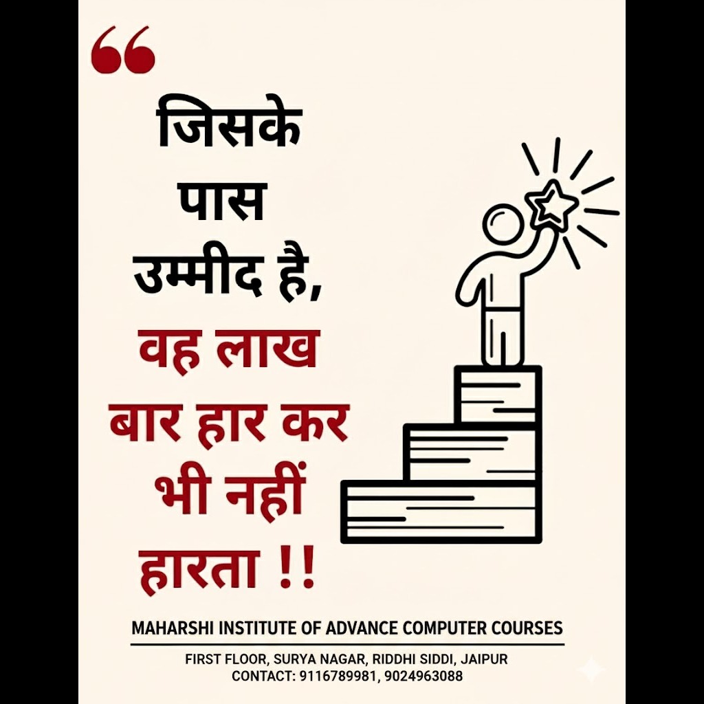 'जिसके पास उम्मीद है, वह लाख बार हार कर भी नहीं हारता!! 🌟 Your hope and determination are your greatest assets. Ready to take the next step toward your goals? Join Maharshi Institute of Advance Computer Courses and turn your dreams into reality! 📍 Address: First Floor, Surya Nagar, Riddhi Siddhi, Jaipur 📞 Contact: 9116789981, 9024963088